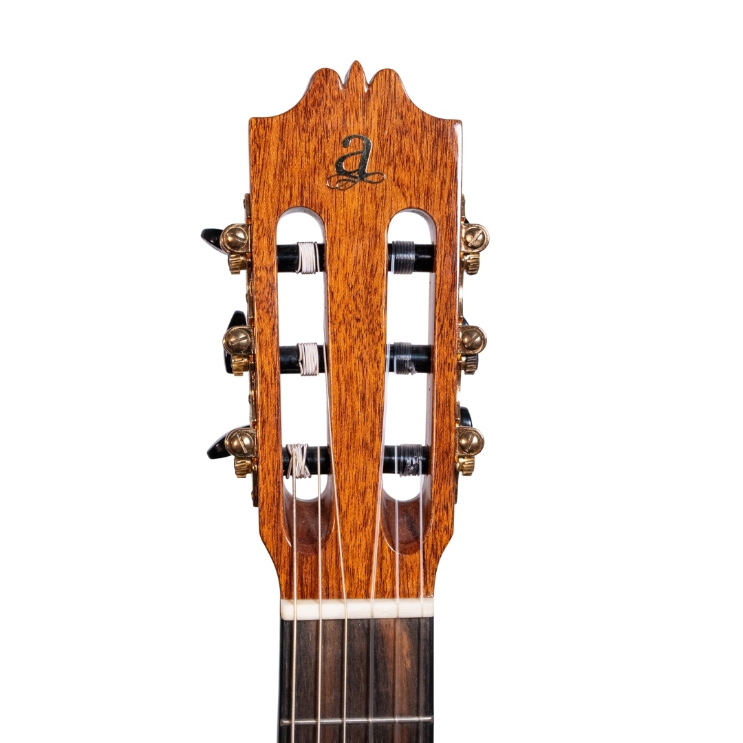 The A40 is crafted with the traditional Spanish heel neck joint which is considered the most highly developed neck joint in guitar construction. It is significantly more complex than a glued neck, but the sonic benefits are worth the effort. When building a guitar with a Spanish neck, neck and headblock are carved from one piece of wood.
