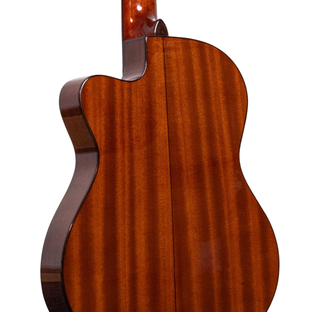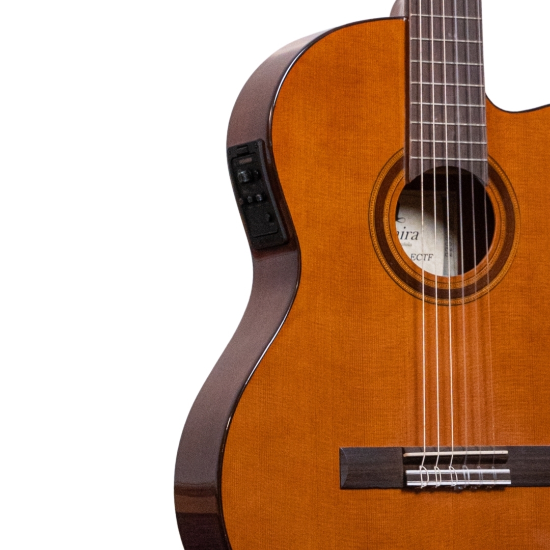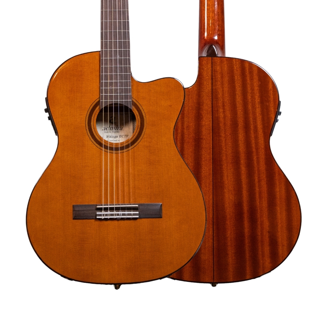 The Admira Malaga ECTF is an electro-classical guitar with cutaway and thin body. Despite its very reasonable price, the Admira Malaga ECTF is a genuine Spanish guitar which is made in Spain using superb materials, precise craftsmanship and a very lovely sound for the price. The action of the guitar has been calibrated to perfection and the sound is very well balanced. As well as the solid cedar top, the Admira Malaga has a sapelly back and sides, African Mahogany neck, and rosewood fingerboard and bridge. With nickel-plated machine heads. The electronics are the Admira EQ-6 or Fishman Classic III.