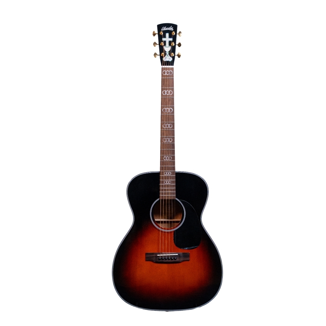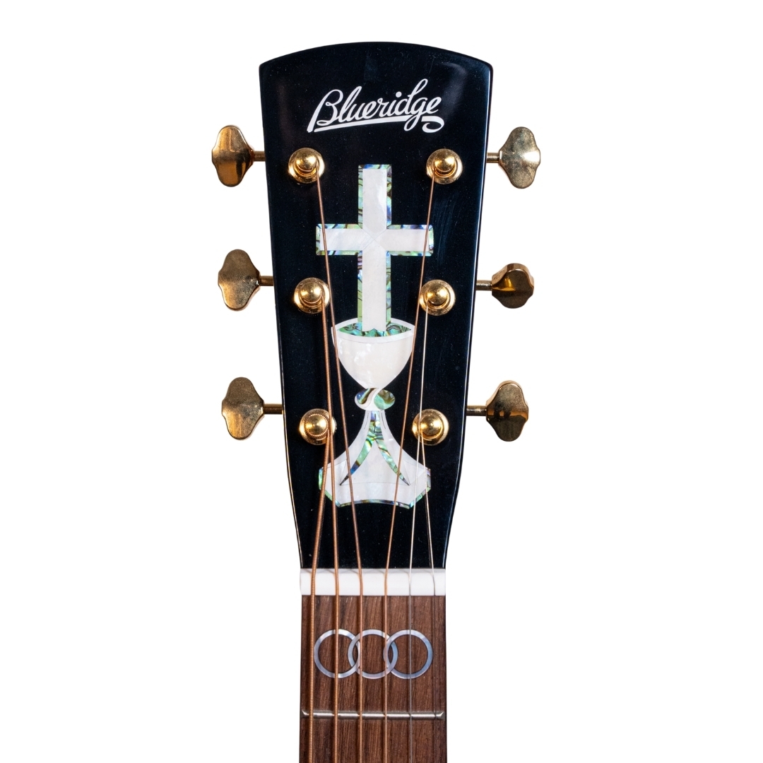 The Blueridge Gospel Model BR-343 acoustic guitar is a member of the Contemporary Series. Mahogany back and sides are topped with solid Sitka spruce, so you'll get a textured tone with plenty of power.. It features a magnificent abalone and pearl Chalice and Cross on the headstock, while the ancient locked ring symbol for the Trinity marks the fingerboard, giving it a stunningly beautiful look.