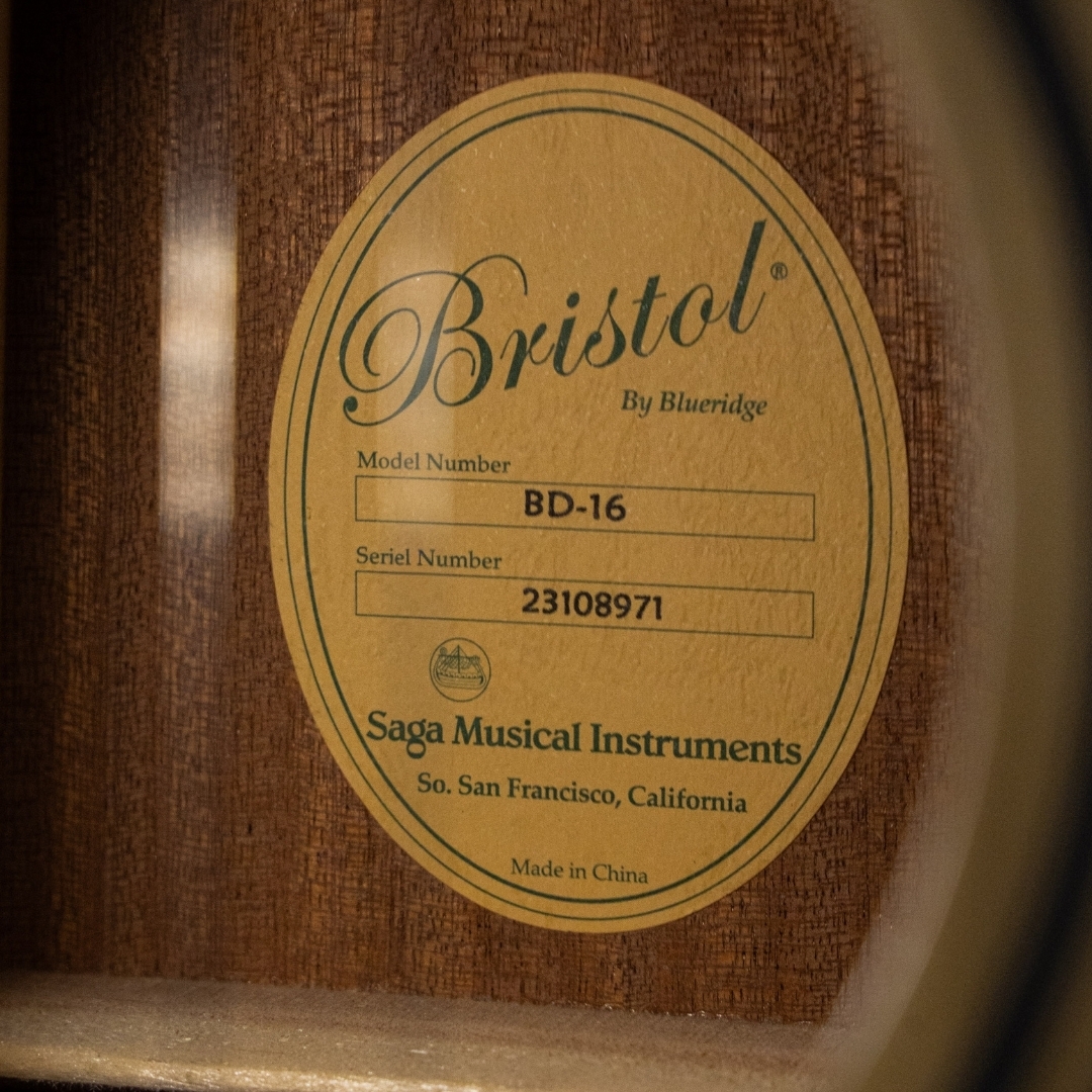 Bristol BD-16 โดย Blueridge เป็นกีตาร์ในระดับราคาเริ่มต้น ที่ผู้ออกแบบตั้งใจทำให้เป็นกีตาร์คุณภาพสูงในราคาที่เหมาะสม และเน้นด้านงานฝีมือที่ดี เหมาะสำหรับผู้ที่ต้องการกีตาร์ที่ใช่งานได้ยาวนานและมีเสียงที่ดีกว่ากีตาร์ยี่ห้ออื่นในราคาใกล้เคียงกัน